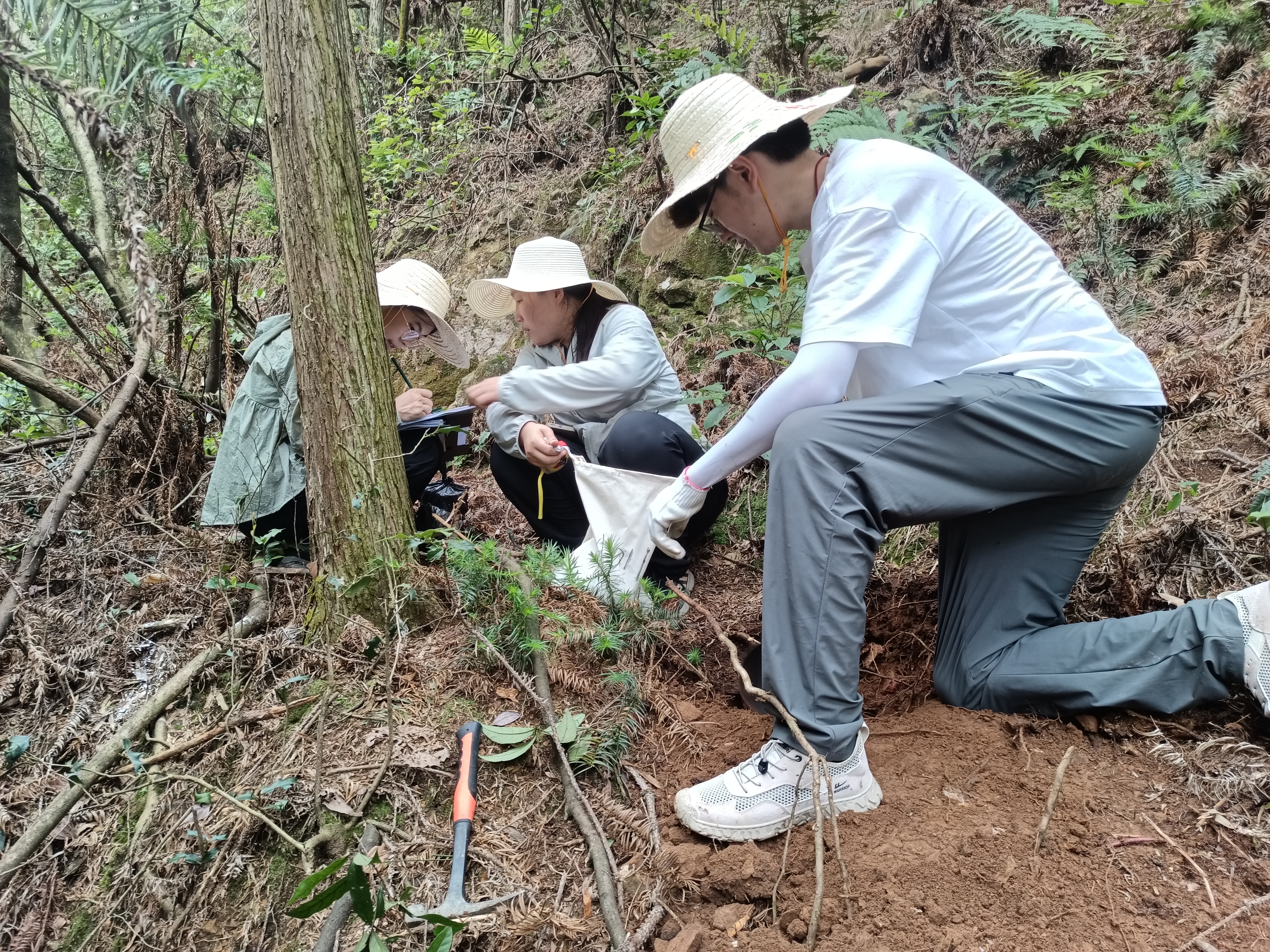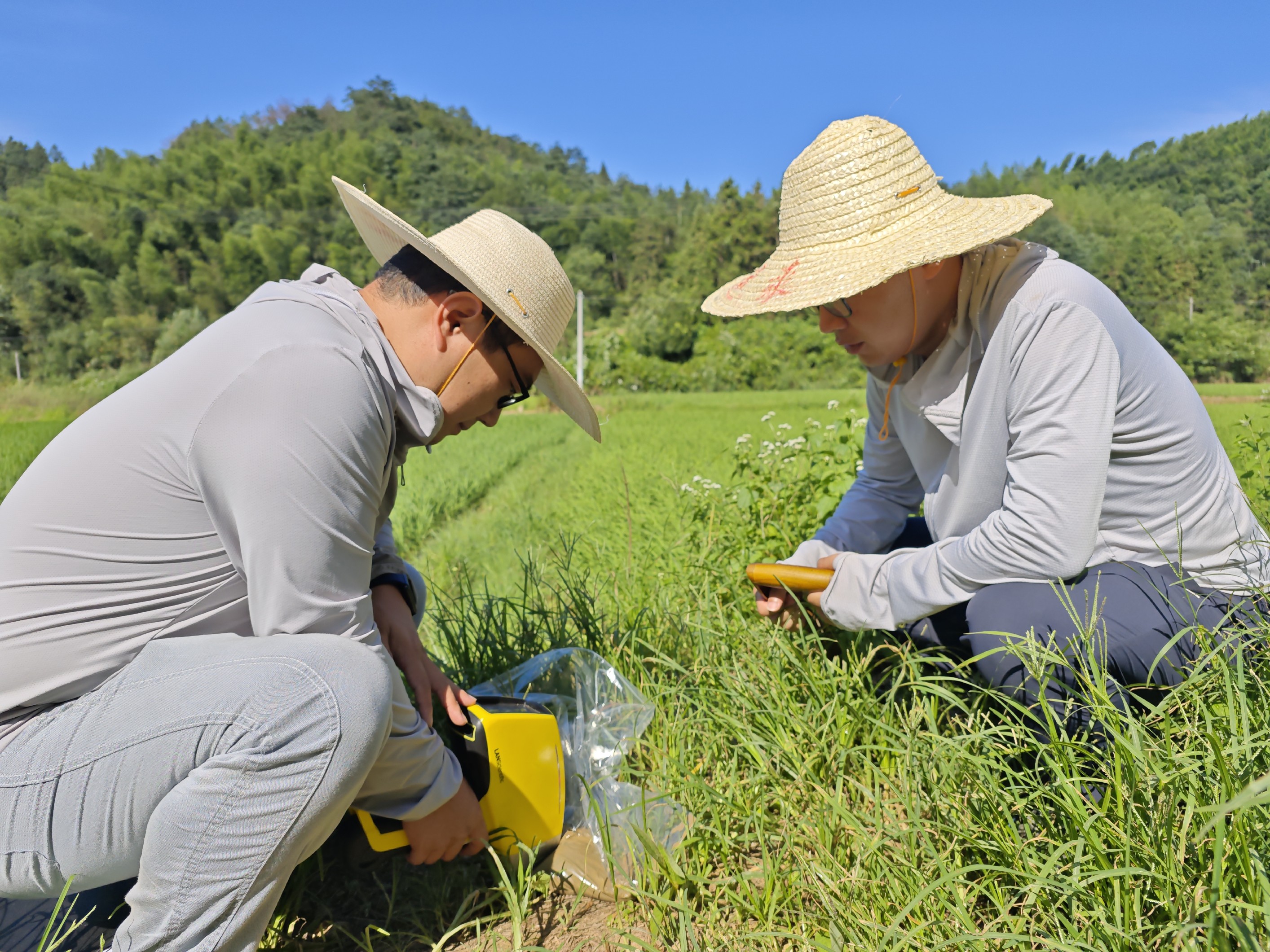 ▲技术人员在桃江县穿凹仑矿区金矿普查项目进行深穿透地球化学方法研究工作,分别开展了地电化学、非晶质锰吸附解析法野外测量。(韦松佚摄)