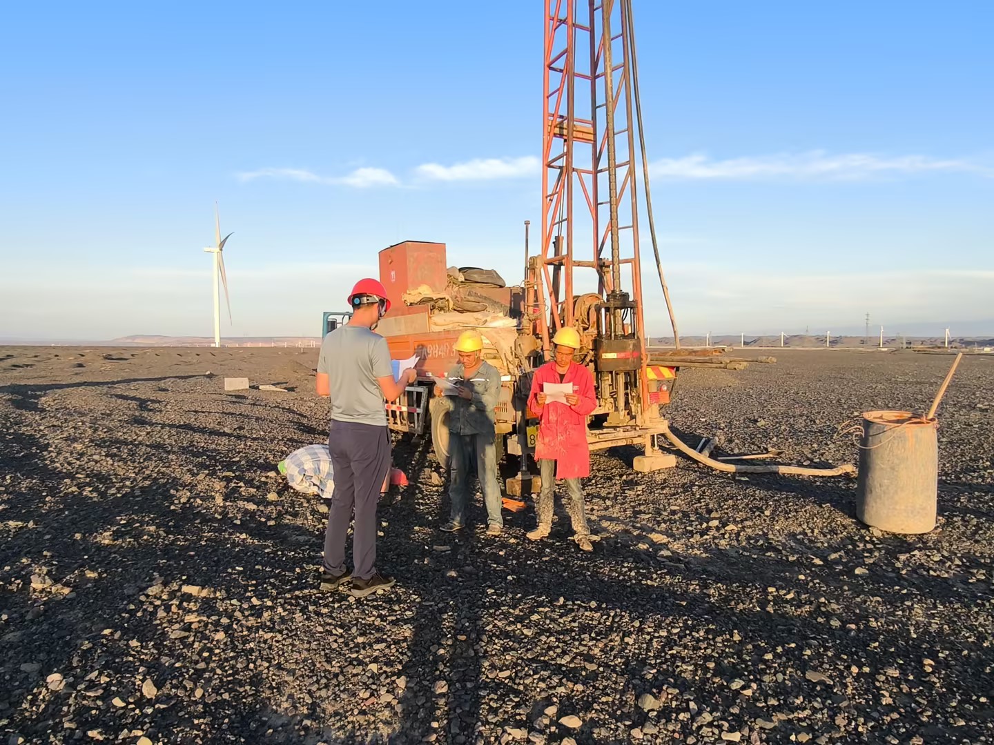 ▲新疆托克逊500MW风电项目初步勘察风机位和升压站钻探施工(邓振业摄)