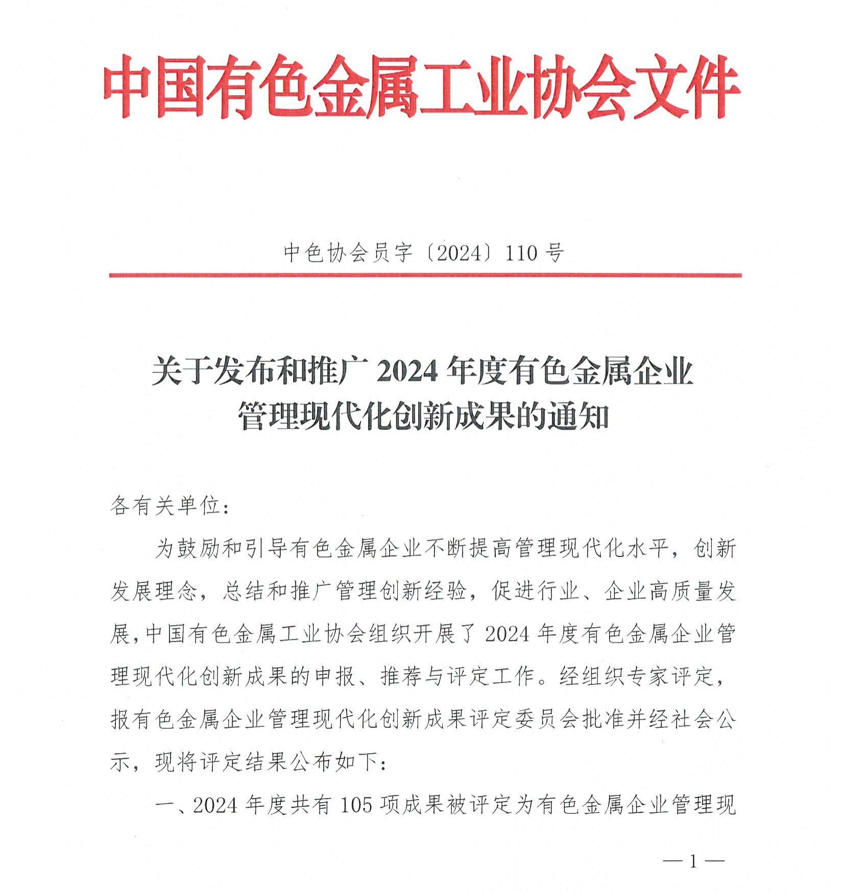 省空间所荣获2024年度有色金属企业管理现代化创新成果一等奖
