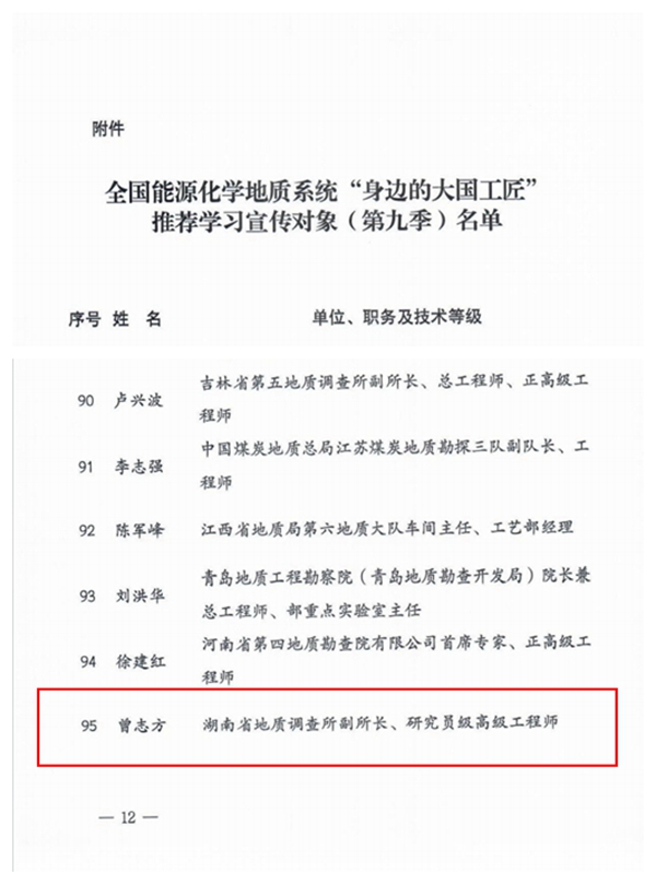 近日,中国能源化学地质工会下发《关于全国能源化学地质系统“身边的大国工匠”推荐学习宣传活动(第九季)的通报》,推出“大国工匠”100名。省地调所副所长、研究员级高级工程师曾志方成功入选,获得“大国工匠”荣誉称号。