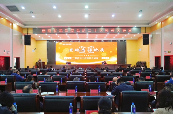 宋瑞祥同志以《为实现强国建设民族复兴在实施新一轮找矿突破战略行动中做出新贡献》为题,以地质科学发展为主线,重点阐释习近平总书记对山东地质大队回信背后的殷殷期盼,宣讲在落实党的二十大精神中如何彰显地质担当。结合一名老地质人的经历,详细讲述了中国地质科学发展史和中国地质事业发展的艰辛历程。在九十分钟的讲座中,已是耄耋之年的宋瑞祥同志精神矍铄,对中国地质重大事件、重要人物如数家珍,对湖南省情、矿情了然于胸,对湖南地质的关心、关切溢于言表。讲座回顾历史,立足当下,展望未来,蕴含着地质百年发展的同与不同、变与不变、传承与创新,发人深思,引起了湖南地质人深深的情感共鸣和精神共鸣。