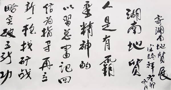 在湖南地质展厅,宋瑞祥深情回忆湖南地质工作的历史变迁及地质找矿的峥嵘岁月,并勉励湖南地质工作者发扬吃得苦、霸得蛮、耐得烦的精神,在现代化建设新征程中再立新功、再创佳绩。