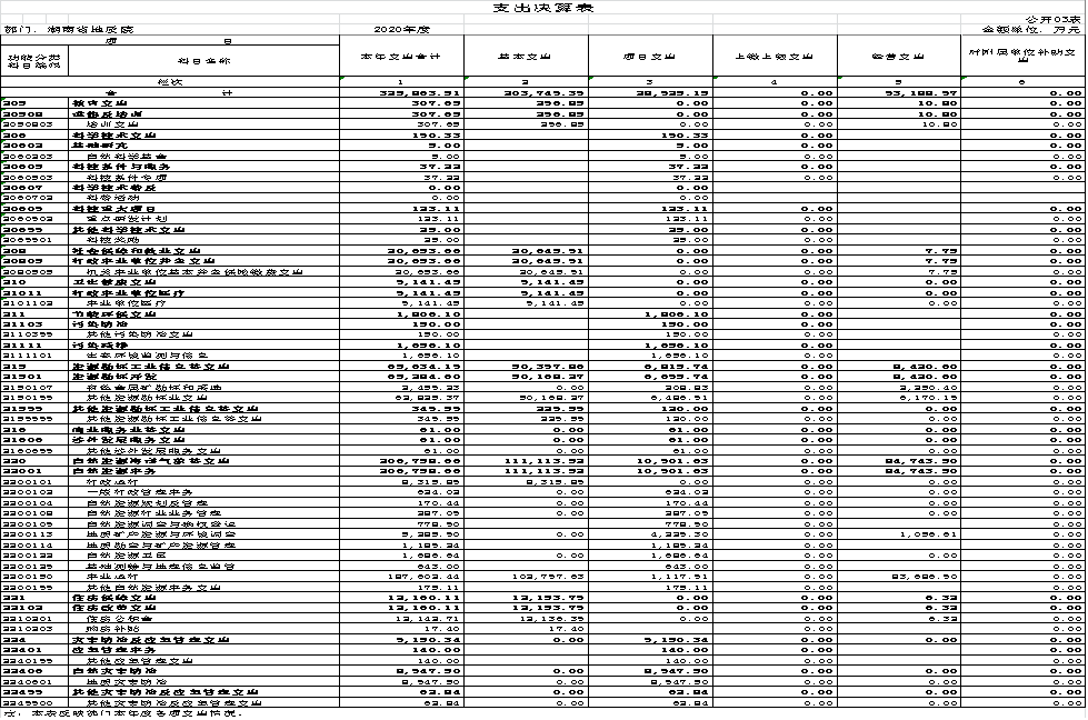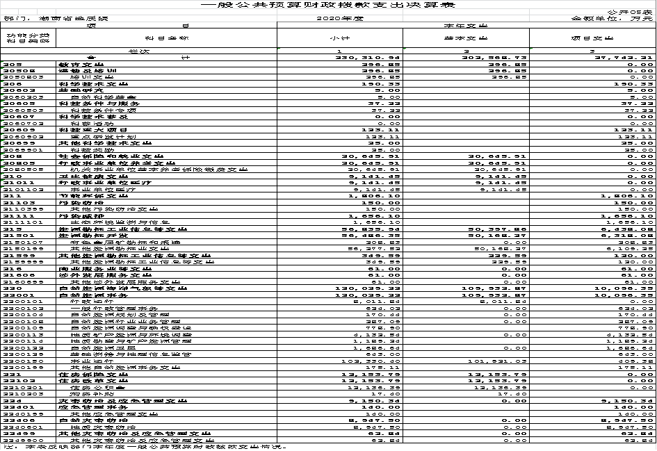 2020年度财政拨款支出230,310.94万元,主要用于以下方面:教育(类)支出296.85万元,占0.13%;科学技术(类)支出190.33万元,占0.08%。社会保障和就业(类)支出20,645.91万元,占8.96%;卫生健康(类)支出9,141.45万元,占3.97%;节能环保(类)支出1,806.10万元,占0.78%;资源勘探信息(类)支出56,835.94万元,占24.68%;商业服务业等(类)支出61.00万元,占0.03%;自然资源海洋气象(类)支出120,029.22万元,占52.12%;住房保障(类)支出12,153.79万元,占5.28%;灾害防治及应急管理(类)支出9,150.34万元,占3.97%。