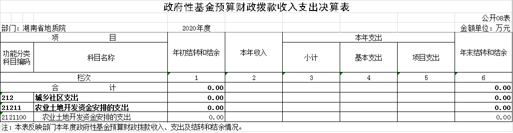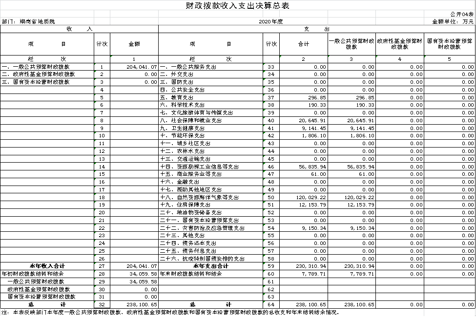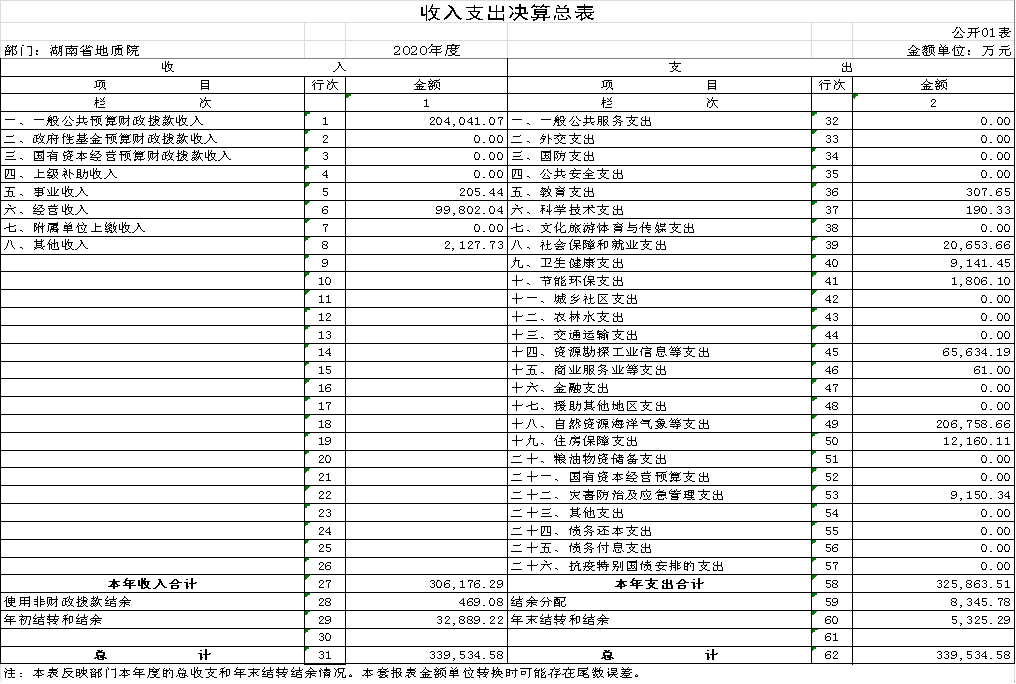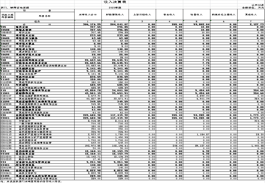 (二)决算单位构成。湖南省地质院2020年部门决算汇总公开单位构成包括以下49家:湖南省地质院本级、湖南省煤田地质局一队、湖南省煤田地质局二队、湖南省煤田地质局三队、湖南省煤田地质局五队、湖南省煤田地质局六队、湖南省煤田地质局物探测量队、湖南省煤田地质局油气资源勘探队、湖南省煤田地质局水工环地质勘探队、湖南省煤炭地质勘查院、湖南省煤田地质局机关后勤服务中心、湖南省地质测试研究院、湖南省地质矿产勘查开发局四〇二队、湖南省地质矿产勘查开发局四〇三队、湖南省地质矿产勘查开发局四〇五队、湖南省地质矿产勘查开发局四〇七队、湖南省地质矿产勘查开发局四〇八队、湖南省地质矿产勘查开发局四〇九队、湖南省地质矿产勘查开发局四一三队、湖南省地质矿产勘查开发局四一四队、湖南省地质矿产勘查开发局四一六队、湖南省地质矿产勘查开发局四一七队、湖南省地质矿产勘查开发局四一八队、湖南省地球物理地球化学勘查院、湖南省湘南地质勘察院、湖南省地质测绘院、湖南省金刚石勘查研究院、湖南省地质调查院、湖南省有色地质勘查局一总队、湖南省有色地质勘查局二总队、湖南省有色地质勘查局工程地质总队、湖南省有色地质勘查局二一四队、湖南省有色地质勘查局二一七队、湖南省有色地质勘查局二四五队、湖南省有色地质勘查局二四七队、湖南省有色地质勘查研究院、湖南省有色地质医院、湖南省有色地质勘查矿业研究信息中心、湖南有色地质工程测试研究中心、湖南省核工业地质局三〇一大队、湖南省核工业地质局三〇二大队、湖南省核工业地质局三〇三大队、湖南省核工业地质局三〇四大队、湖南省核工业地质局三〇六大队、湖南省核工业地质局三一一大队、湖南省核工业超硬材料研究所、湖南省核工业地质调查院、湖南省核工业地质局探矿技术研究所、湖南省核工业地质局培训中心。