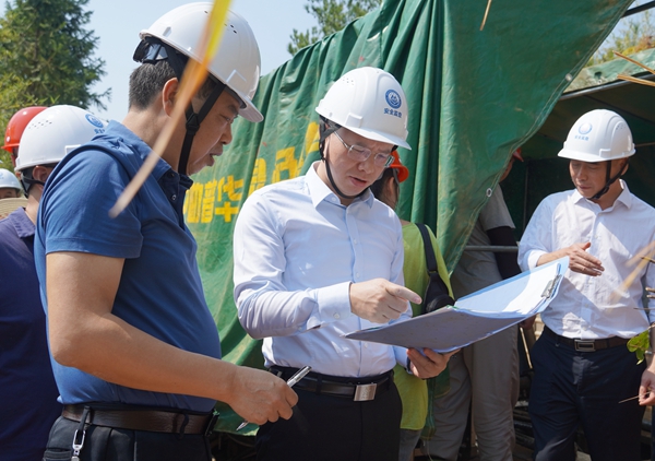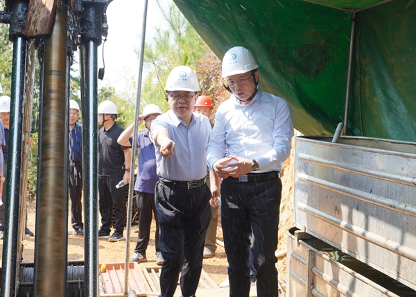 在永享矿区项目工地,谈文胜顶着烈日爬坡上山,先后来到正在施工的1号、2号钻机机台,对正在野外作业的职工表示慰问,并仔细查看机台工作环境、安全设施配备情况,检查工作流程与安全规定落实情况,查验相关工作台帐记录,详细了解钻探工作进度、工作编排等情况。他指出,当前野外施工作业,山高坡陡又面临持续高温,一定要时刻注意施工安全,按照标准化建设各项要求,落实人员防护、设备管理、资料管理、交通运输、森林防火及地质灾害防范等方面的安全管控措施,确保安全生产和施工质量。并要求地灾所加强对项目的管控,通过这个重点项目的组织实施,力争在找矿上创品牌、施工上严标准、管理上树形象、模式上探新路。