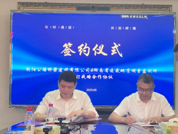 9月28日下午,湖南地质遥感所与衡阳公路桥梁建设有限公司在衡阳举行战略合作协议签约仪式,双方就资源共享、技术协同、项目共创达成合作共识,标志着遥感地质技术与公路桥梁建设正式开启跨界融合的关键一步。