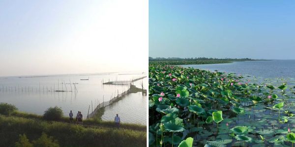 2017年9月大通湖治理前湖面围网 2024年6月大通湖治理后荷花美景