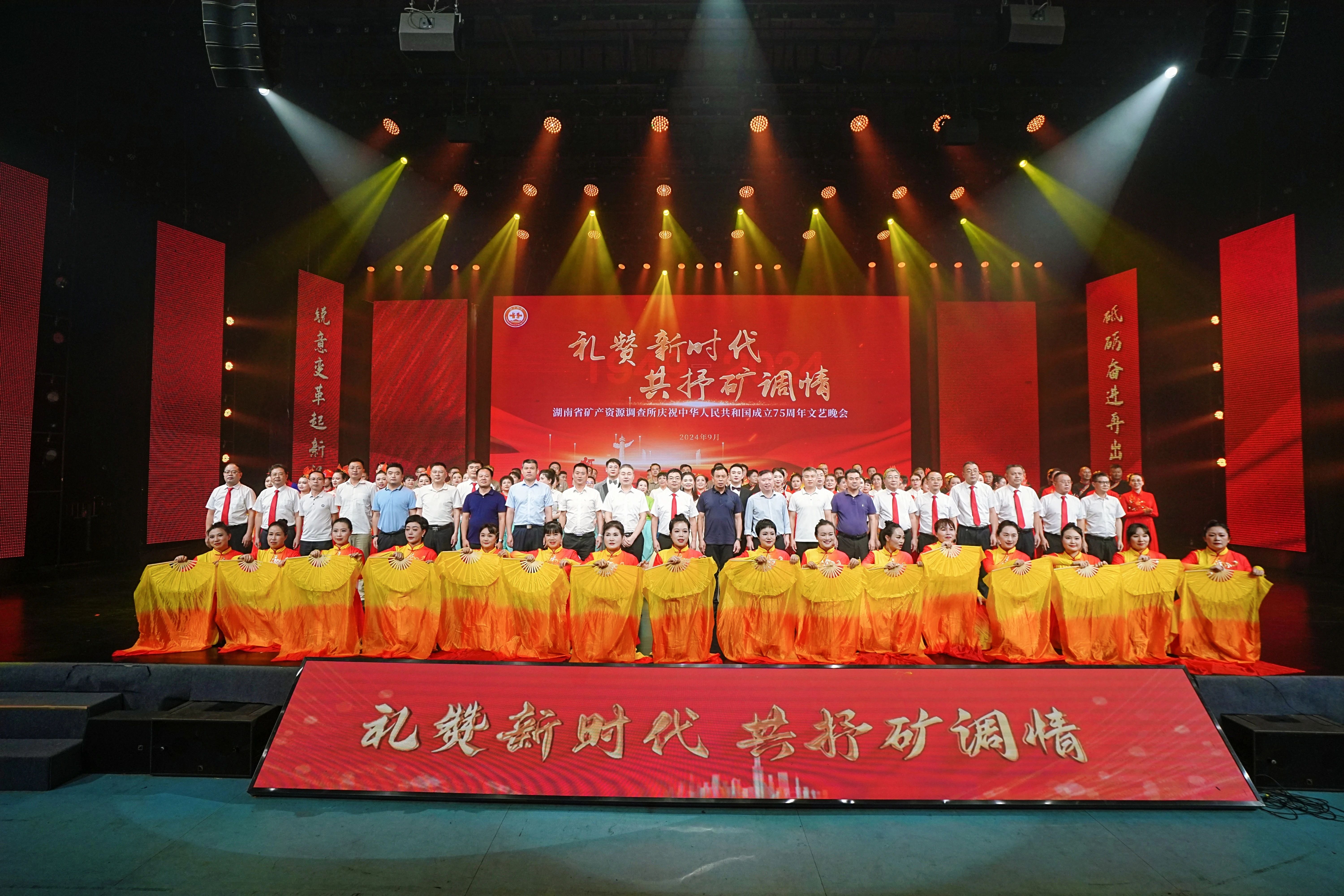 9月29日晚,省矿调所庆祝中华人民共和国成立75周年文艺晚会在郴州市广电中心一号演播大厅举行,郴州市自然资源和规划局、市应急管理局、矿山企业代表和该所职工代表500余人齐聚一堂,共庆祖国母亲75周年华诞。