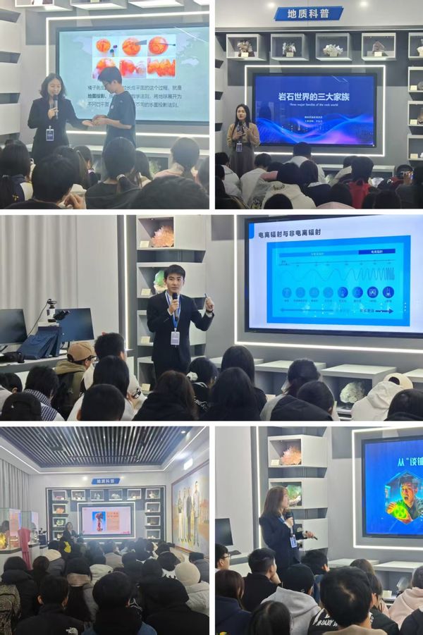 作为我省重要的科普教育基地与行业文化窗口,展厅还为同学们量身打造了特色科普课堂。来自水环所的陈思洁、地调所的李钰杰、核地质调查所的李海洋、核地质调查所的李芬芬、核地质调查所的匡慧丽五位科普讲解员,以深入浅出的讲解、趣味十足的互动,带领同学们解锁地质科学的奥秘,丰富了专业知识,拓宽了科学视野,让大家真切感受到地质领域的独特魅力。