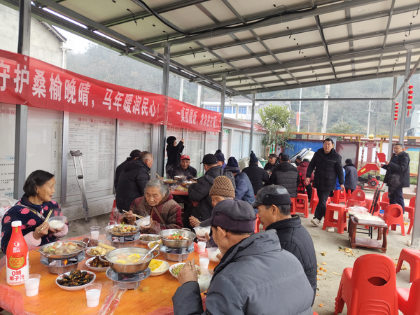 谭村村地处山区,特殊群体较多。2026年2月6日,村部张灯结彩,五张圆桌整齐摆放,30多位独居、孤寡老人和退休老村干部欢聚一堂,共享热气腾腾的石门特色火锅和家常菜。工作队队员全程陪同,添菜倒茶、拉家常,现场欢声笑语,暖意融融。