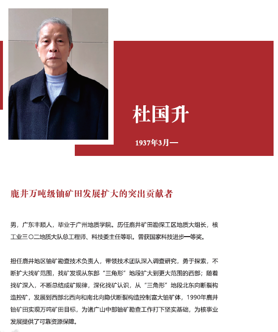 “中国铀业功勋榜”是中国铀业最高荣誉奖,是为表彰曾为我国核地矿事业创建、发展做出卓越贡献的开创者和引领者设立的奖项。领奖台上,杜国升同志心潮澎湃,他感言获得此项荣誉,倍受鼓舞、深感自豪,希望新一代地质人万分珍惜一代又一代老前辈历经千辛万苦取得的辉煌成就,继承发扬老一辈的精气神,把英雄的赞歌继续谱写下去,再创新的辉煌。