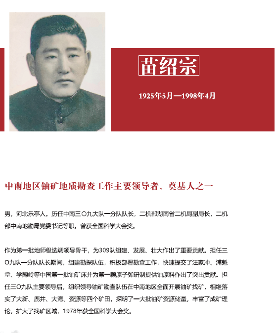 12月11日,由中国铀业有限公司主办的纪念中国核地矿创建65周年座谈会在北京会议中心举行。会议总结回顾了我国核地矿事业65年来取得的历史成就和宝贵经验,并致敬表彰了李四光等48位荣登“中国铀业功勋榜”的核地矿功勋模范人物,湖南省地质院苗绍宗、王学曾、杜国升等3位杰出地质人荣耀上榜。