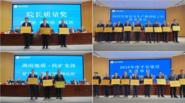 大会通报了2025年度院属单位及领导班子年度考核结果、高质量发展重点工作任务完成情况、院属单位安全生产和消防工作、平安建设工作考核结果及“十四五”优秀地质项目成果,为第一届院长质量奖、第一批‘湖南地质・找矿先锋’品牌获评单位授牌,院属各单位主要负责人递交2026年度绩效评价指标任务书。