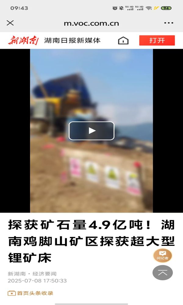 【湖南日报】探获矿石量4.9亿吨!湖南鸡脚山矿区探获超大型锂矿床