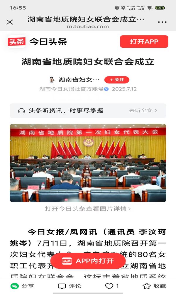 今日女报/凤网讯(通讯员 李汶珂 姚岑)7月11日,湖南省地质院召开第一次妇女代表大会,来自院系统的80名女职工代表齐聚一堂,选举成立湖南省地质院妇女联合会,这标志着省地质系统妇女工作迈入新阶段,全院女地质工作者有了更坚实的组织依托与更温暖的“娘家”支撑。院党委书记谈文胜,省妇联党组书记、主席杨兰英出席会议并讲话。
