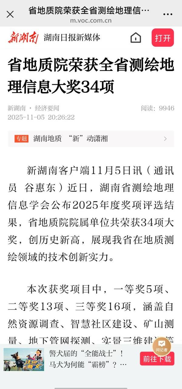 新湖南客户端11月5日讯(通讯员 谷惠东)近日,湖南省测绘地理信息学会公布2025年度奖项评选结果,省地质院院属单位共荣获34项大奖,创历史新高,展现我省在地质测绘领域的技术创新实力。