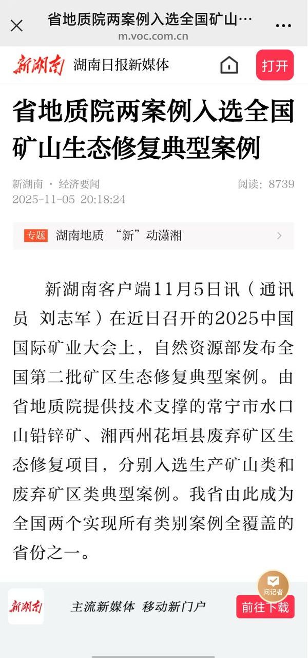 新湖南客户端11月5日讯(通讯员 刘志军)在近日召开的2025中国国际矿业大会上,自然资源部发布全国第二批矿区生态修复典型案例。由省地质院提供技术支撑的常宁市水口山铅锌矿、湘西州花垣县废弃矿区生态修复项目,分别入选生产矿山类和废弃矿区类典型案例。我省由此成为全国两个实现所有类别案例全覆盖的省份之一。