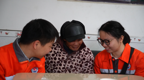 阳佩琪和周钢向老人介绍当时的地质情况。湖南省常宁市融媒体中心 供图