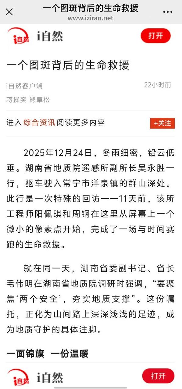 2025年12月24日,冬雨细密,铅云低垂。湖南省地质院遥感所副所长吴永胜一行,驱车驶入常宁市洋泉镇的群山深处。此行是一次特殊的回访——11天前,该所工程师阳佩琪和周钢在这里从屏幕上一个微小的像素点开始,完成了一场与时间赛跑的生命救援。