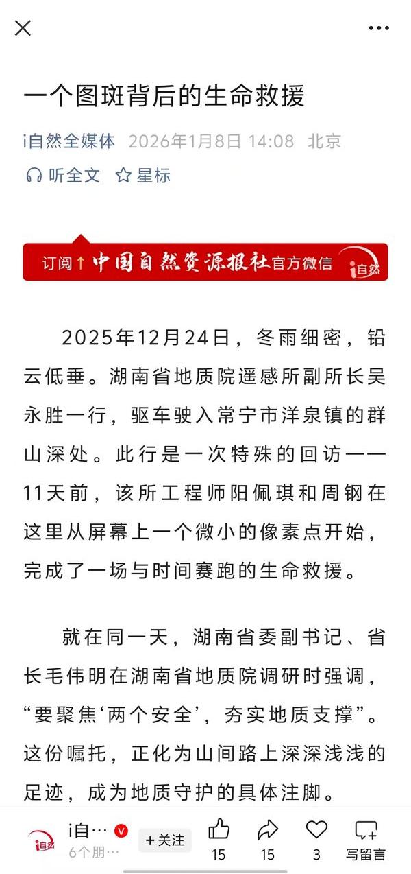 2025年12月24日,冬雨细密,铅云低垂。湖南省地质院遥感所副所长吴永胜一行,驱车驶入常宁市洋泉镇的群山深处。此行是一次特殊的回访——11天前,该所工程师阳佩琪和周钢在这里从屏幕上一个微小的像素点开始,完成了一场与时间赛跑的生命救援。