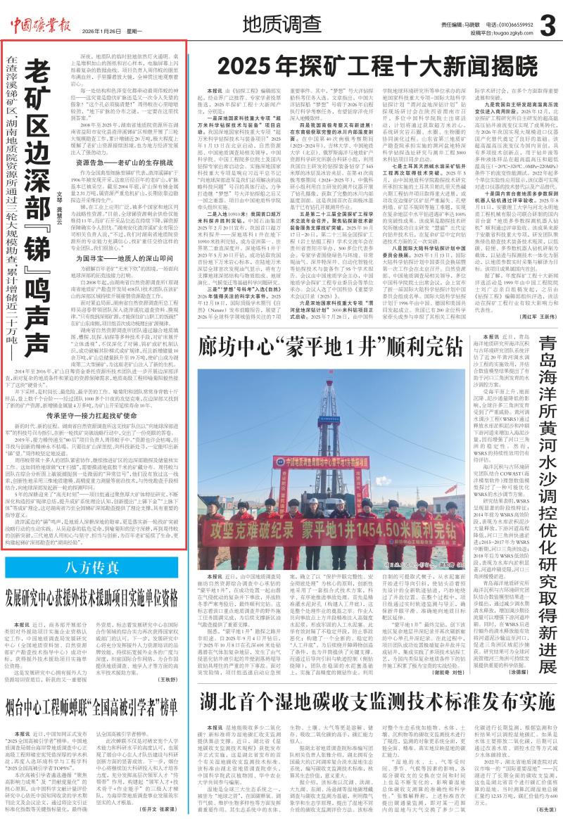 2008 年至 2025 年,湖南省地质资源所在湖南省益阳市安化县渣滓溪锑矿区相继开展了三轮大规模勘查工作,累计增储近 20 万吨,极大程度上缓解了老矿山资源接续困境,也为地方经济发展注入了强劲动力。