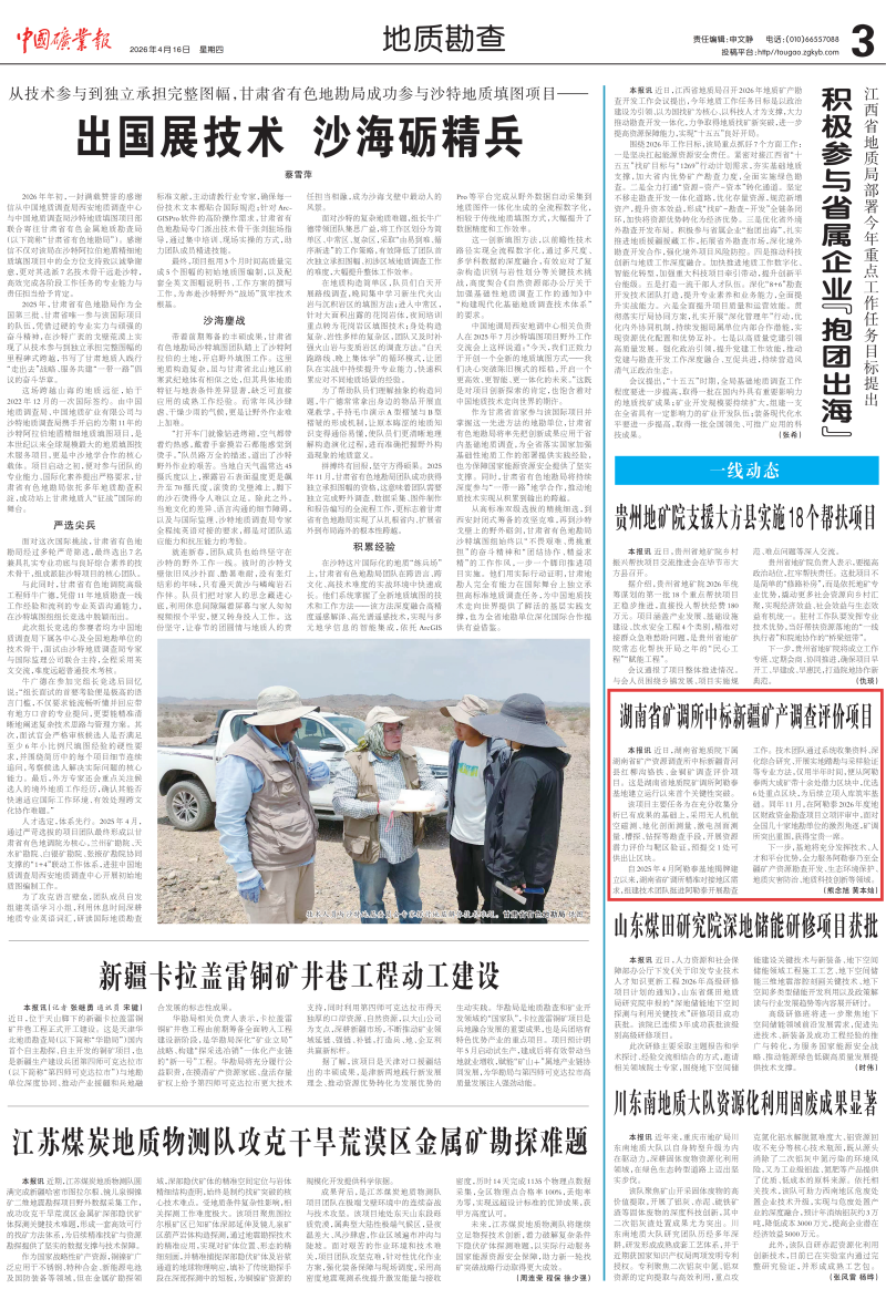 【中国矿业报】湖南省矿调所中标新疆矿产调查评价项目