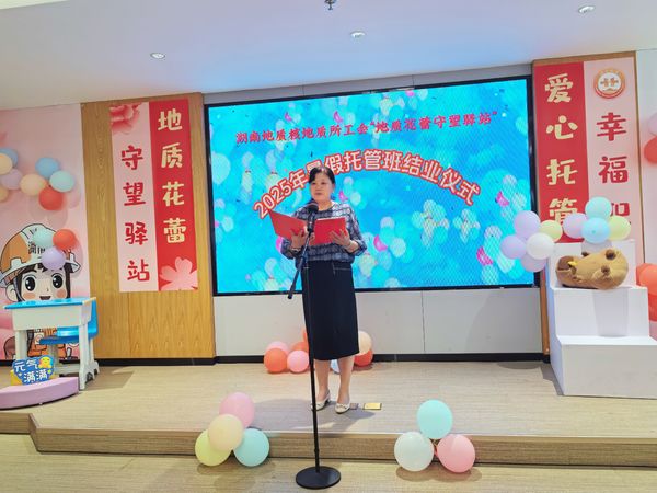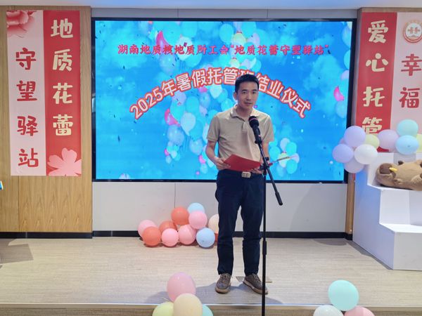 8月22日,“地质花蕾守望驿站”2025年暑期托管班结业仪式在湘地大厦20楼举行。省地质工会主席刘胜平、省地质院核地质所党委书记赵胤淳参加仪式并讲话,所工会主席张昭贤,家长代表、志愿者老师及托管班全体师生80余人参加。