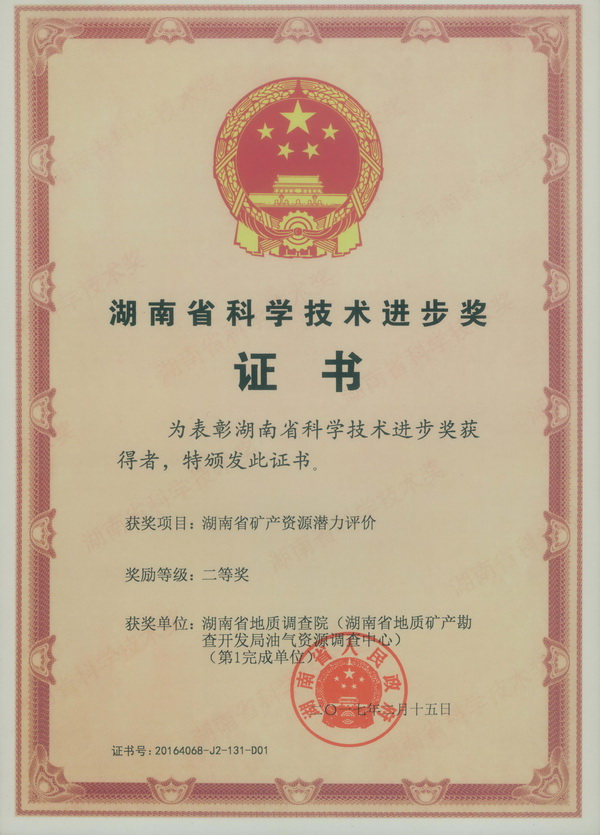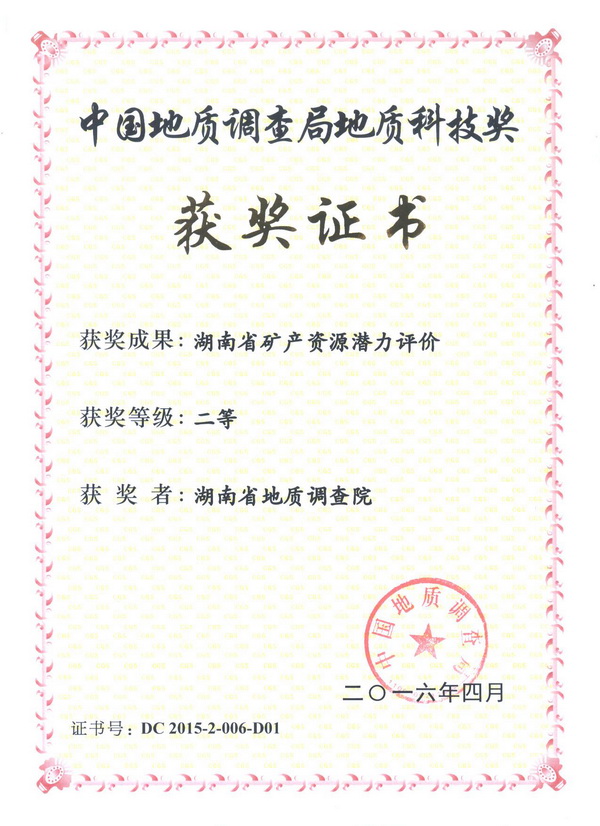 应用广泛收获赞誉。项目成果广泛应用于湖南省区划选点、矿产勘查、综合研究等领域,特别是花垣—凤凰铅锌整装勘查、锡田钨锡矿整装勘查应用矿产预测成果,实现了找矿区位、类型、规模上的重大突破。在人才培养方面,依托该项目培养出博士2人、硕士10人,二级教授1人,研究员级高级工程师2人,享受国务院政府津贴专家1人。项目成果达到国内领先水平,2016年获得中国地质调查局地质科技进步二等奖,2017年获湖南省科技进步二等奖。由于该项目组织实施好、成果突出,湖南省地调院获国土资源部颁发的全国矿产资源潜力评价工作“先进集体奖”。