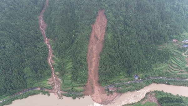 因持续降雨,怀化市气象局6月30日1时50分发布了沅陵县北部降雨红色预警预报。1时53分,怀化市地质灾害防治工作领导小组办公室要求政府部门立即组织受地质灾害威胁的群众进行避灾转移。省地灾所值班值守技术人员接到指令后,坚决落实转移指令,与乡政府一起组织借母溪乡符家坪村及张家村隐患点、切坡建房户3户15人转移,4时18分,人员全部转移安置到位。6时13分左右,沅陵县借母溪乡符家坪村G241国道北侧山体发生了坡面泥石流。省地灾所专家团队接到应急处置抢险指令后,采用“天地空”一体结合方式于当天下午提供了对G341国道的应急处治方案,并助力政府具体实施,对快速抢通341国道起到重要作用。