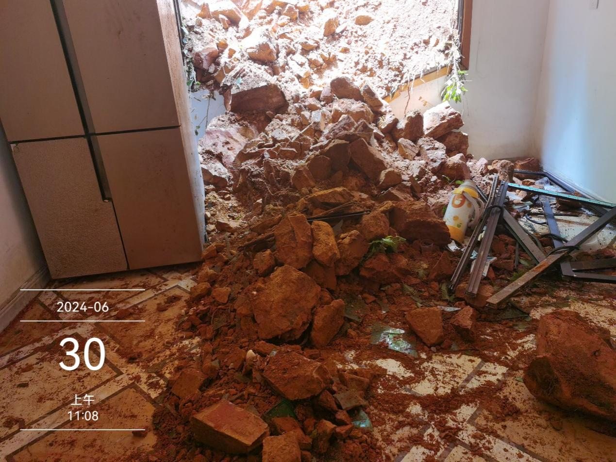 6月30日凌晨0点20分左右,村民陈某房屋边坡突发崩滑,摧毁房屋一间卧室和一间餐厅。因预警信息发布及时,防灾措施落实到位,人员提前转移,2户5人成功避险。