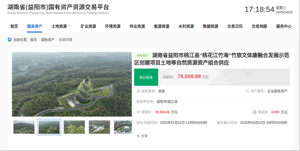 4月23日,湖南省益阳市桃江县“桃花江竹海”竹旅文体康融合发展示范区自然资源资产组合供应项目在益阳市公共资源交易中心成功交易。桃江县遇见美文化旅游开发有限公司以7.89亿元的最高报价摘得该资产组合标的。这是湖南省迄今为止成交金额最大的资产组合供应项目,也是省地调所全方位支撑全省资产组合供应,服务县域经济高质量发展的又一次有力实践。