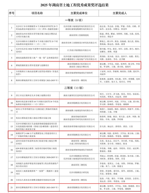 10月28日,湖南省土地学会公布2025年湖南省土地工程优秀成果奖评选结果,湖南省地质院地灾所下属省勘测设计院有限公司申报的四项成果分获一、二等奖。