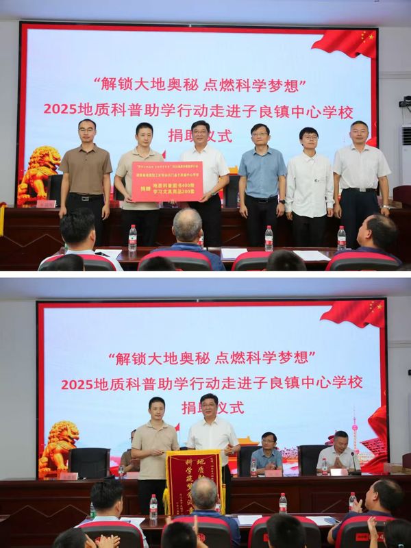 在省地质院关工委、团委、妇联的共同指导下,省地质院工矿所党委书记、副所长张铁红带队,党委副书记肖宏文、副所长黄超刚等一行来到校园,不仅送来了地质科普图书、学习文具和一批矿物教学标本,更带来了一整套“量身定制”的课程设计。学校回赠锦旗时,张铁红表示:“这面旗是荣誉,更是责任。我们始终坚守资源勘探与防灾减灾的主责主业,也积极履行社会责任,把专业的科学知识用孩子们听得懂的方式送进课堂。”