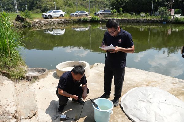 村落里的老井多在院角或村口,井口用水泥砌成圆形,上面盖着厚重的铁盖,边缘早已被岁月磨得发亮。欧阳波罗蹲下身,用力掀开铁盖——随着“吱呀”一声闷响,一股带着泥土气息的凉意扑面而来,井水里泛着细碎的波光,倒映着头顶的蓝天。朱鹏鹏随即用取样桶从井里打出半桶水,将多参数测试仪缓缓放入桶内,待水没过水位线,便开始读取参数:“水温19.29℃、PH数值5.3、氧化还原电位417mV、电导率139.1μS/cm、溶解氧7.07mg/L。”一个个参数从他口中清晰吐出,欧阳波罗在一旁飞快地记录着。
