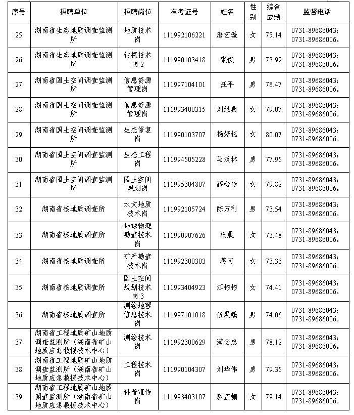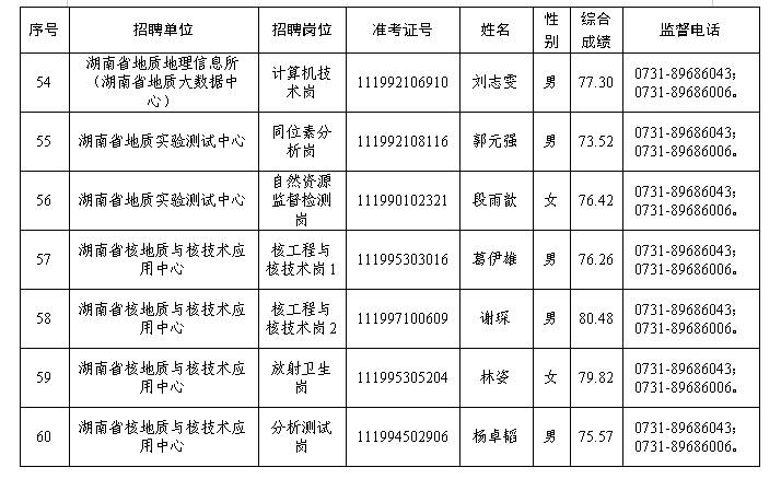 根据《湖南省省直事业单位2025年第三次集中公开招聘工作人员公告》有关要求,经报名、资格审查、笔试、面试/实操、体检、考察等程序,确定黄熠和等60名同志为湖南省地质院所属事业单位2025年公开招聘拟聘用人员,现予以公示。