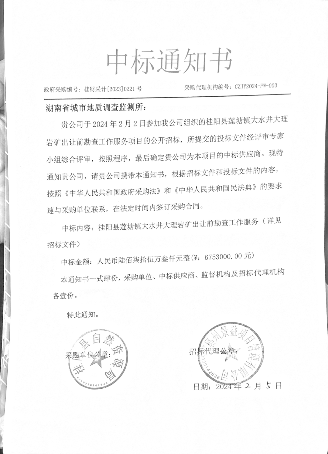 龙腾启新程,奋战“开门红”。新年伊始,继资勘中心中标安化县两个花岗岩矿勘查项目后,省城调所地质找矿领域再传佳音,所城市地下资源利用工程技术研究中心成功摘获桂阳县莲塘镇大水井大理岩矿勘查项目,合同额675万元。