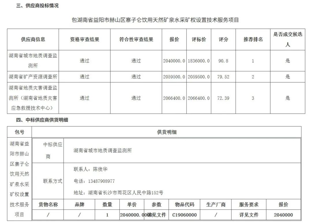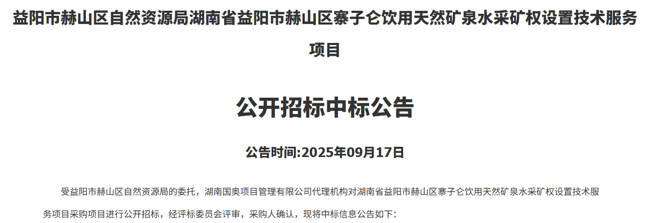 近日,湖南省地质院城调所成功中标湖南省益阳市赫山区寨子仑饮用天然矿泉水采矿权设置技术服务项目,合同金额204万元。