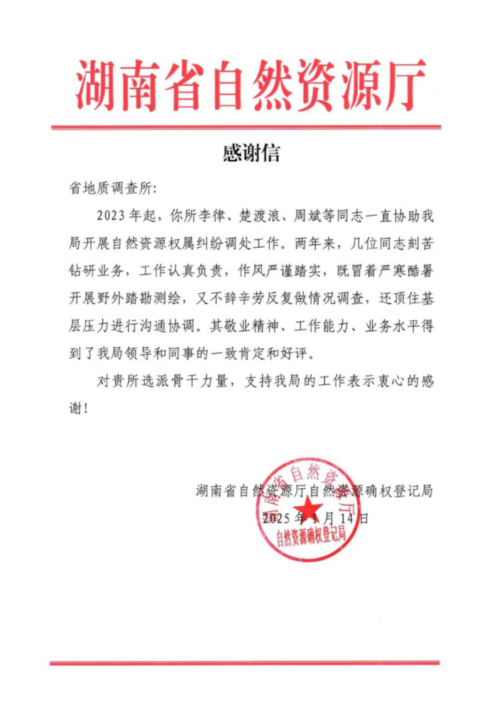 近日,省自然资源厅自然资源确权登记局向省地调所发来感谢信,对省地调所派遣技术团队的敬业精神、工作能力、业务水平给予高度好评,对地调所技术支撑省厅确权登记局的工作表示衷心地感谢。