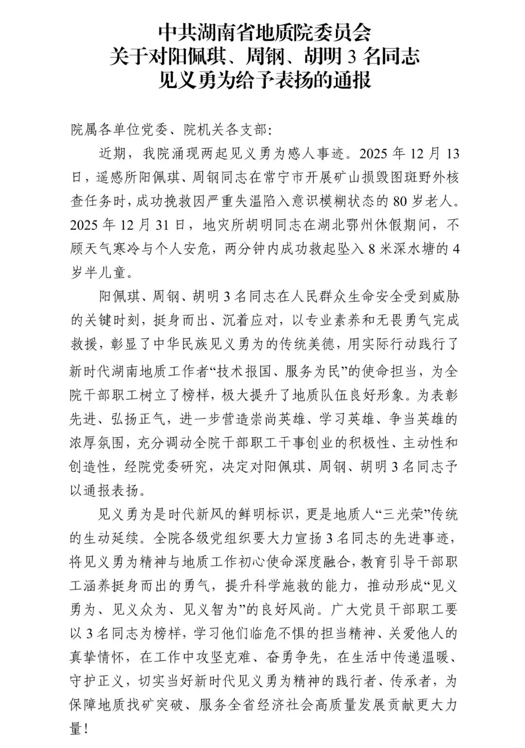 通报指出,胡明等同志在关键时刻挺身而出完成救援,彰显了中华民族见义勇为的传统美德,用实际行动践行了新时代湖南地质工作者“技术报国、服务为民”的使命担当,为全院干部职工树立了榜样,极大提升了地质队伍良好形象。