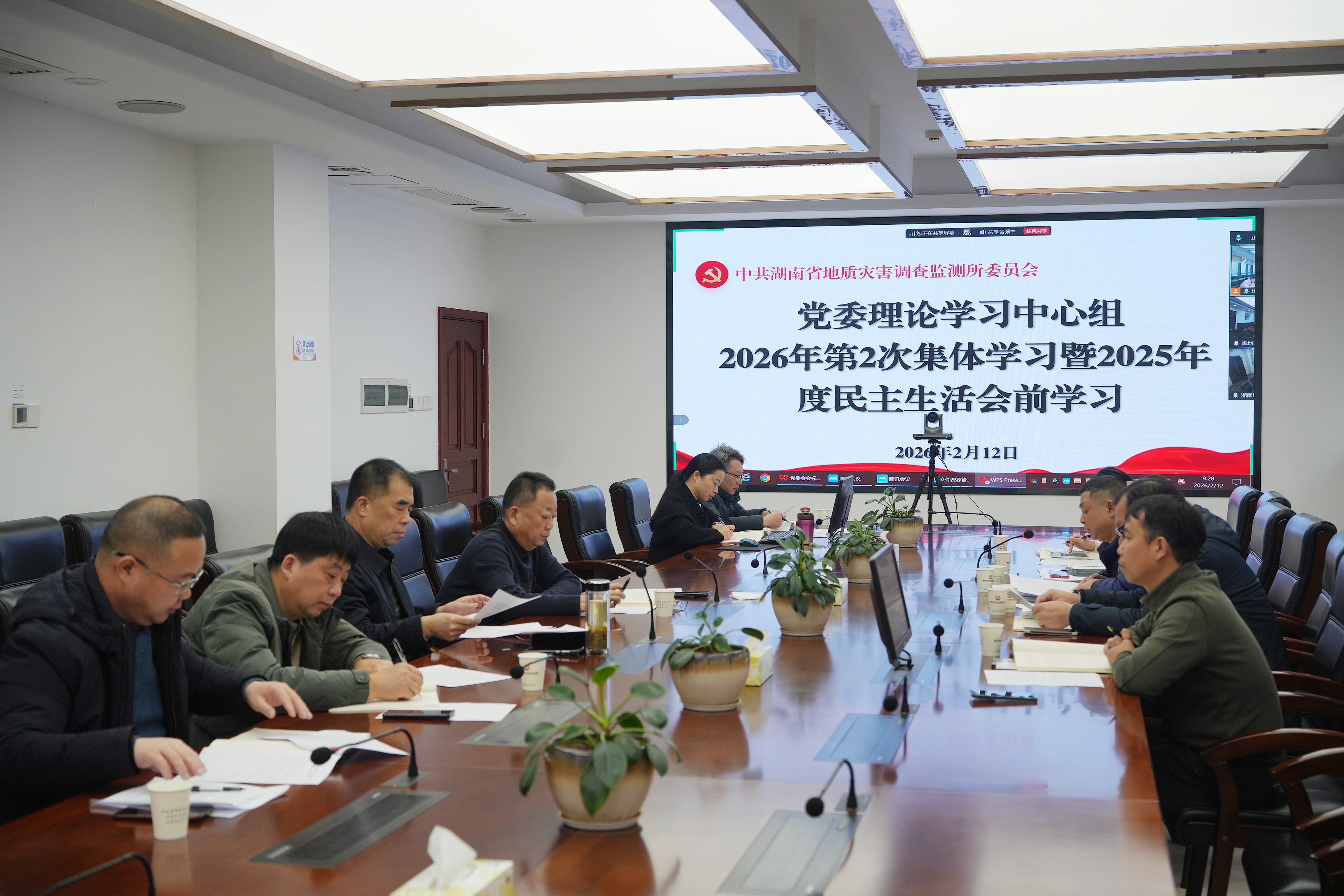 2月12日,湖南省地质院地灾所举行党委理论学习中心组2026年第二次集体学习暨2025年度民主生活会会前学习,深入学习领会习近平总书记关于党的建设、党的自我革命的重要思想,习近平总书记关于全面加强党的纪律建设、加强党的作风建设的重要论述,传达学习习近平总书记在中共中央政治局民主生活会上的重要讲话精神、湖南省委常委班子2025年度民主生活会精神,两位同志围绕加强党的作风建设、推动党的二十届四中全会精神落地落实作主题发言,为开好民主生活会打牢思想政治基础。所党委班子成员、所领导、相关部室负责人参加会议。