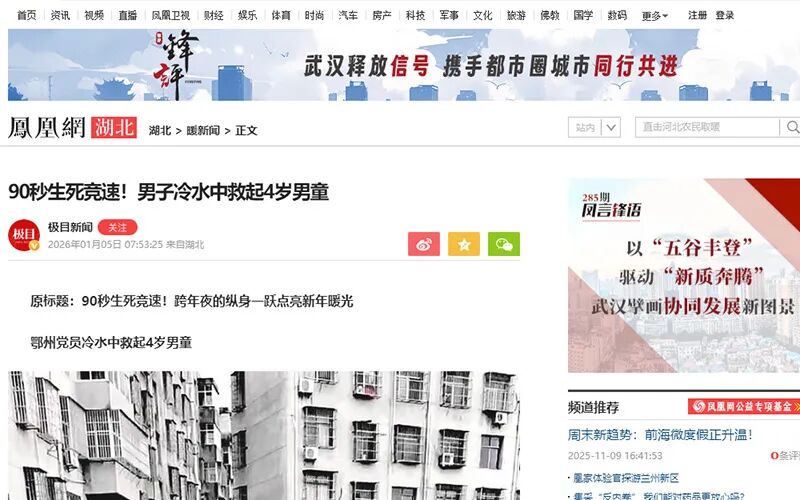 2026年1月5日 凤凰网湖北《90秒生死竞速!男子冷水中救起4岁男童》