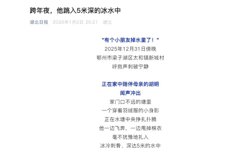 2026年1月2日 今日头条《4岁男童寒冬落水,90秒黄金救援!党员胡明纵身跃入刺骨水塘》