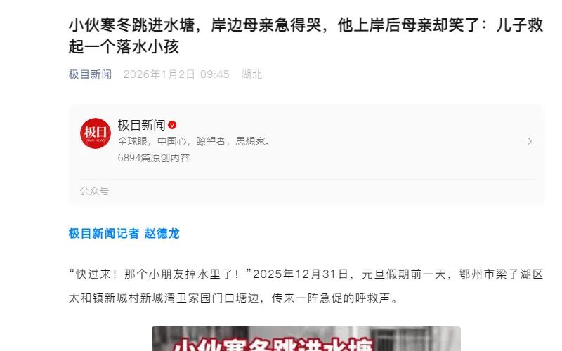 2026年1月2日 极目新闻《小伙寒冬跳进水塘,岸边母亲急得哭,他上岸后母亲却笑了:儿子救起一个落水小孩》