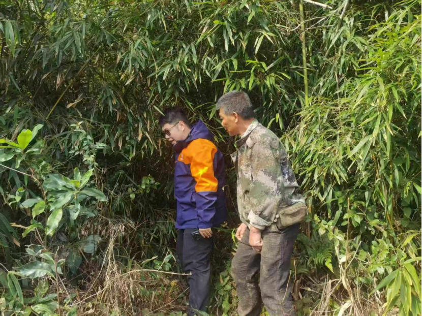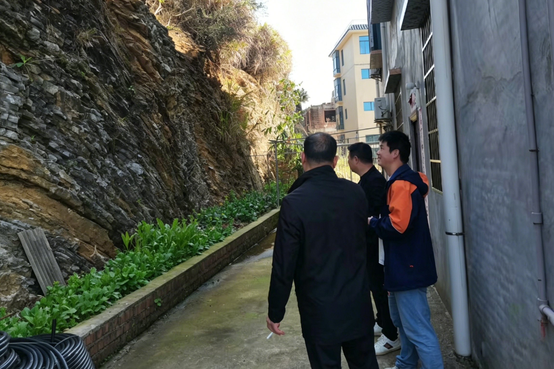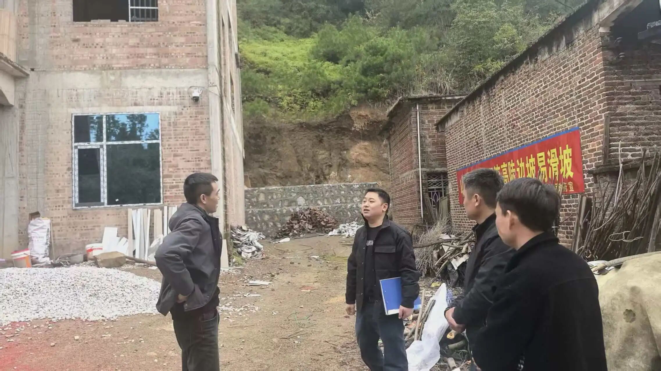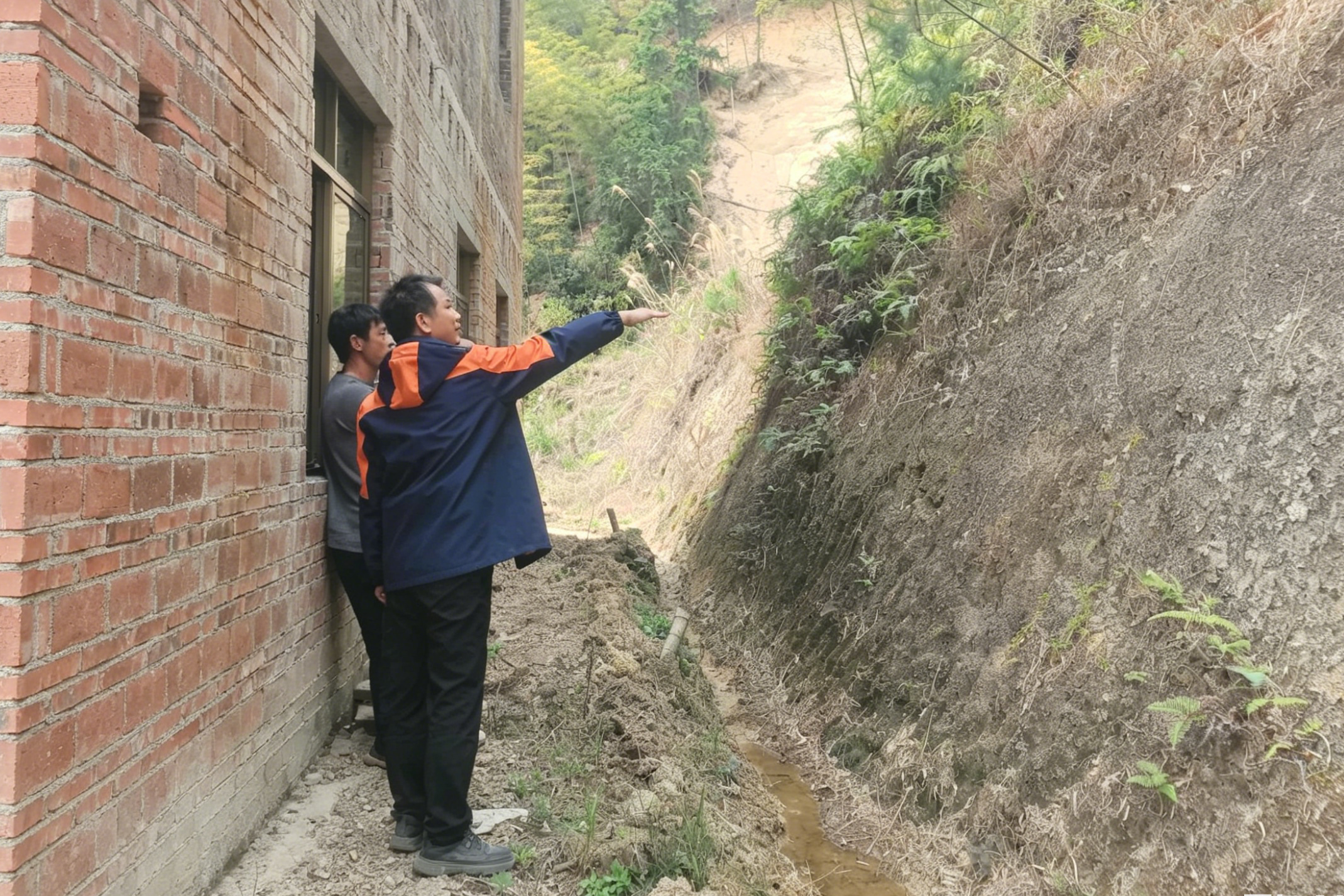 与村民查看切坡建房情况