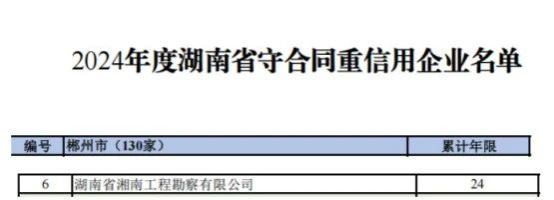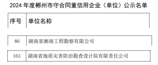 近日,省矿调所下属湖南省湘南工程勘察有限公司荣获 2024 年度湖南省 “守合同重信用企业” 称号,连续 24 年获此殊荣。同时,该公司与其下属的湖南省地质灾害防治勘查设计院有限责任公司双双跻身2024年郴州市“守合同重信用单位”榜单。
