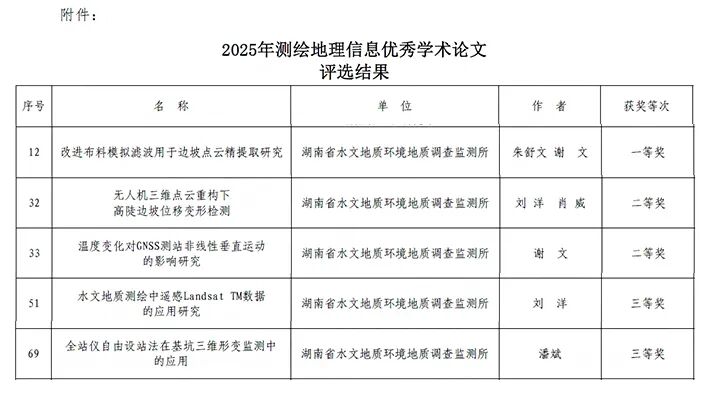 此次获奖是湖南省测绘地理信息学会对省地质院水环所在测绘科技创新、工程实践及学术研究等方面工作的高度认可。省地质院水环所将以此为契机,再接再厉,持续深耕测绘地理信息技术前沿,为行业发展贡献更多力量。(文/朱培培)