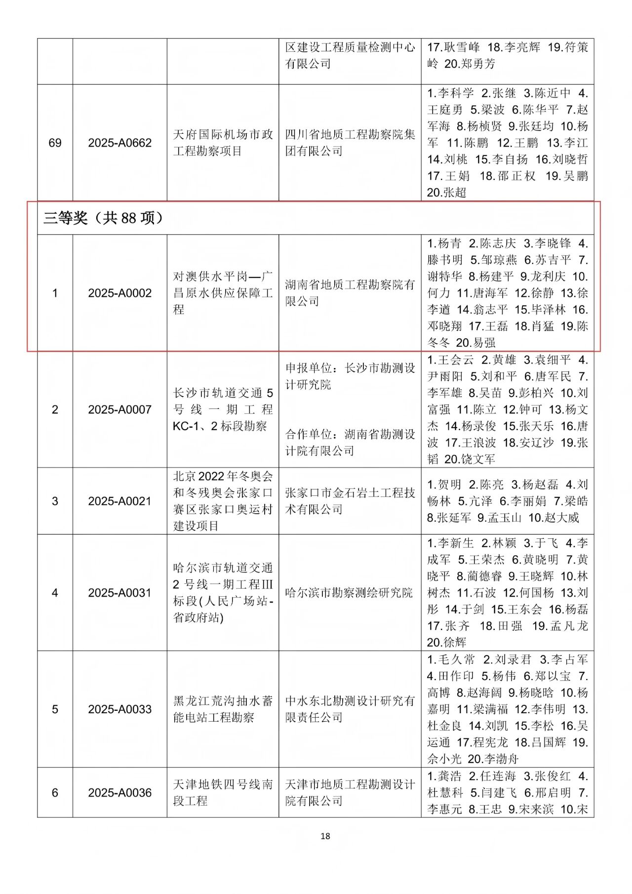 2025年11月28日,中国勘察设计协会正式公布2025年度全国优秀工程勘察设计奖获奖名单。作为我国工程勘察设计领域极具权威性与影响力的国家级奖项,本次评选竞争激烈、标准严苛。省地质院水环所下属企业——湖南省地质工程勘察院有限公司凭借过硬的技术实力和高质量的项目成果,在激烈竞争中脱颖而出,其承建的“对澳供水平岗—广昌原水供应保障工程”荣获全国优秀工程勘察三等奖。