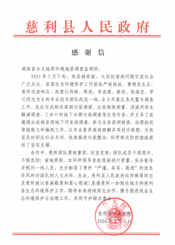 守护绿水青山 彰显责任担当——慈利县人民政府致信感谢省地质院水环所