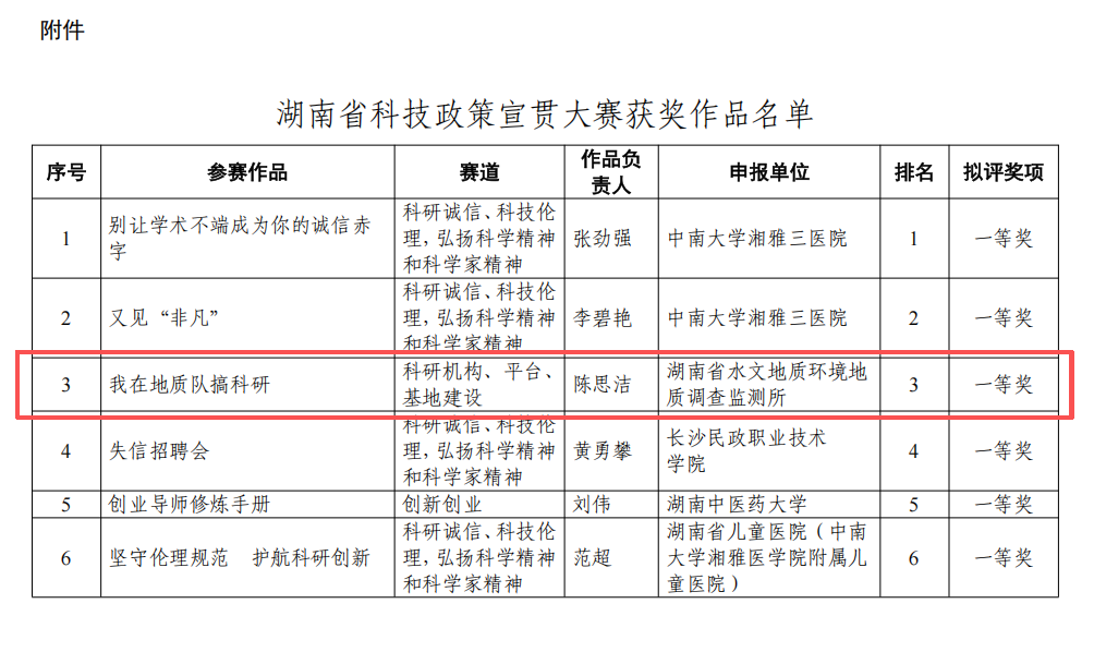 此次获奖是我所通过创新科普形式与传播手段,积极推动科技政策向一线落地的重要体现,为提升政策知晓度、推动科研与实践深度融合作出了积极探索。未来,省地质院水环所将继续发挥专业与平台优势,加大科技政策宣传与科普创作力度,助力更多青年科技人才在创新实践中成长成才,为湖南省科技事业高质量发展贡献地质智慧与力量。(文字/陈思洁 编辑/申卫卫)