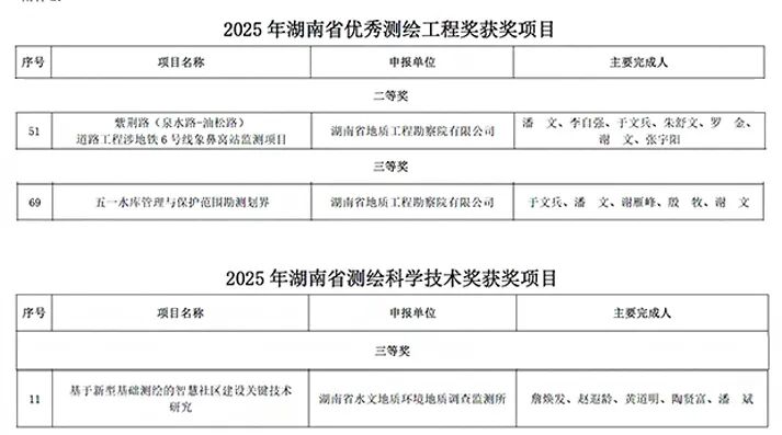 近日,湖南省测绘地理信息学会公布了“2025年湖南省测绘科学技术奖和优秀测绘工程奖”和“2025年测绘地理信息优秀学术论文”评选结果。省地质院水环所凭借扎实的技术实力与突出的创新成果,在众多参评项目中脱颖而出,一举斩获8项大奖,彰显了其在测绘地理信息领域的强劲综合实力。 在获奖项目中,《紫荆路(泉水路-油松路)道路工... .....